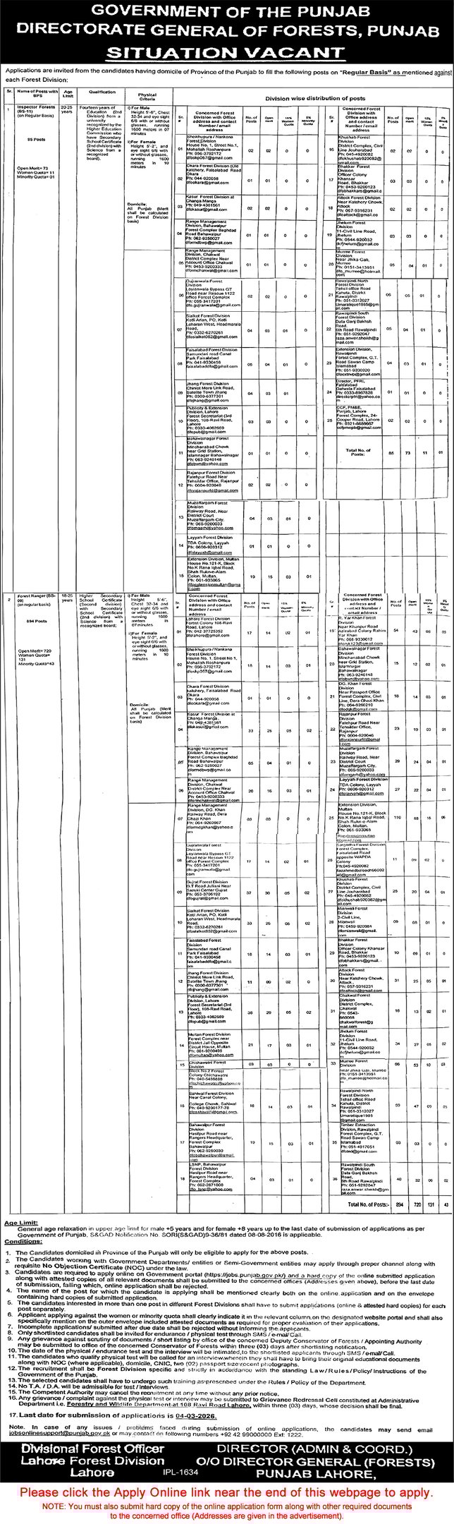 Forest Department Punjab Jobs 2026 February Apply Online Forest Rangers & Inspectors in Lahore Division