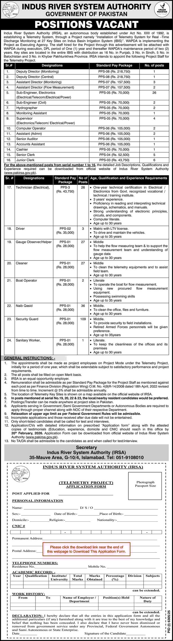 Indus River System Authority Jobs 2026 February Application Form Sub Engineers, Security Guards, Naib Qasid & Others IRSA