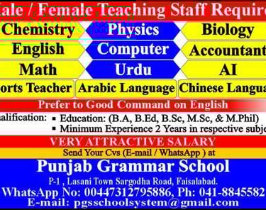 Explore teaching job opportunities for various subjects including Chemistry, Physics, Biology, English, and Computer Science at Punjab Grammar School in Faisalabad for the year 2026. Apply now to join a prestigious institution!